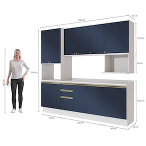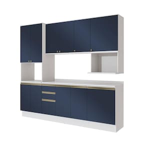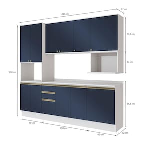 Acabamento: Pintura Brilho / Pintura Fosco | Cor: Branco/Azul Profundo | Corrediças: Telescópicas | Dobradiça: Com Amortecimento | Garantia: 3 meses para defeito de fabricação | Matéria-prima: MDF / MDP | Peso suportado por cada gaveta: 6 Kg | Peso suportado por cada prateleira: 7 kg | Puxadores: Alumínio / Metálicos / Puxadores de Metal e de Alumínio | Quantidade de gavetas: 3 | Quantidade de portas: 1 / 3 | Quantidade de prateleiras: 1 / 2 / 4 | Sistema de montagem: Parafuso Philips | Tipo de porta: Bater | Montagem: Necessita montagem | Tipo de garantia: Garantia do fabricante | Duração da garantia: 3 meses | Tipo de móveis de cozinha: Combo de móveis de cozinha | Requer montagem: Sim