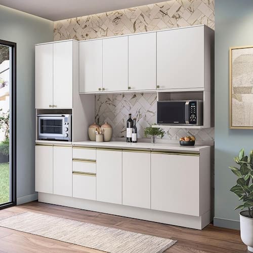Além da possibilidade de montá-los com pezinhos, que podem ser adquiridos separadamente, você deixa a sua cozinha do jeito que sempre quis. Os puxadores, com modelos diferentes no balcão e aéreos, são metálicos na cor dourada, completando a beleza e o design do produto. Renove seu espaço e o deixe ainda mais completo com Conjunto CB1437 da Cozinha Celeste Kappesberg.