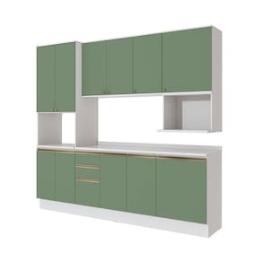 Acabamento: Pintura Brilho / Pintura Fosco | Cor: Branco/Verde Oliva | Corrediças: Telescópicas | Dobradiça: Com Amortecimento | Garantia: 3 meses para defeito de fabricação | Matéria-prima: MDF / MDP | Peso suportado por cada gaveta: 6 Kg | Peso suportado por cada prateleira: 7 kg | Puxadores: Alumínio / Metálicos / Puxadores de Metal e de Alumínio | Quantidade de gavetas: 3 | Quantidade de portas: 1 / 3 | Quantidade de prateleiras: 1 / 2 / 4 | Sistema de montagem: Parafuso Philips | Tipo de porta: Bater | Duração da garantia: 3 meses | Tipo de garantia: Garantia do fabricante | Montagem: Necessita montagem | Tipo de móveis de cozinha: Combo de móveis de cozinha | Requer montagem: Sim