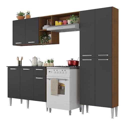 Conteúdo da Embalagem: 1 (um) armário aéreo com nicho lateral e horizontal de 166cm 1 (um) paneleiro duplo de 62cm 1 (um) balcão com tampo de 105cm