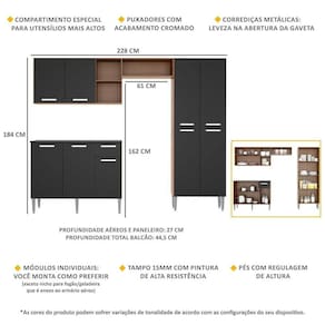 Dimensões do produto montado: Cozinha: Altura: 184cm | Largura: 228cm | Profundidade: 27cm (aéreos e paneleiro) - 44,5cm (balcão com tampo) Espaço do nicho para fogão/geladeira: Altura: 162cm | Largura: 61cm *Você pode consultar as medidas internas na imagem técnica do produto.