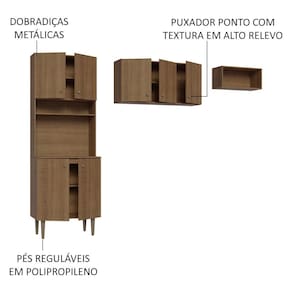 Materiais de alta qualidade: possui corrediças e dobradiças metálicas, puxadores no estilo ponto com textura e pés reguláveis em material reciclado.