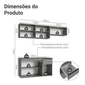 52 cm de profundidade no balcão e 31 cm nos aéreos