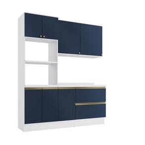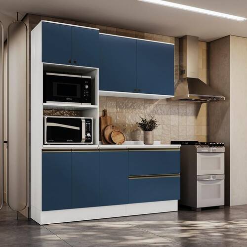 Acabamento: Pintura Brilho / Pintura Fosco | Cor: Branco/Azul Profundo | Corrediças: Telescópicas | Dobradiça: Com Amortecimento | E possivel montar o produto sem os pés?: Sim | Garantia: 3 meses para defeito de fabricação | Gavetas: Externas | Matéria-prima: MDF / MDP | Peso suportado por cada prateleira: 7 kg | Peso suportado por gaveta: 6 kg | Puxadores: Alumínio / Metálicos / Puxadores de Metal e de Alumínio | Quantidade de gavetas: 2 | Quantidade de portas: 1 | Quantidade de prateleiras: 1 / 4 | Sistema de montagem: Parafuso Philips | Tipo de porta: Bater | Duração da garantia: 3 meses | Montagem: Necessita montagem | Tipo de garantia: Garantia do fabricante | Tipo de móveis de cozinha: Combo de móveis de cozinha | Requer montagem: Sim