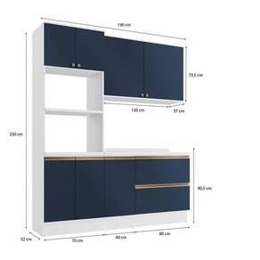 Transforme sua cozinha com toda a beleza e praticidade do Conjunto CB1391 da Cozinha Celeste Kappesberg. Produzido 100% em MDF de 15mm, o que garante mais robustez, firmeza e qualidade, além de um acabamento perfeito. São 230cm de altura, 1,90m de largura e 52cm de profundidade no balcão e 37cm nos aéreos. A caixaria é em pintura na cor branca e acabamento brilho, enquanto as frentes são na cor azul profundo, com acabamento fosco.