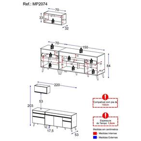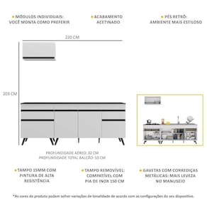 Altura: 203cm | Largura: 220cm | Profundidade: 32cm (aéreo) - 53cm (balcão com tampo)
