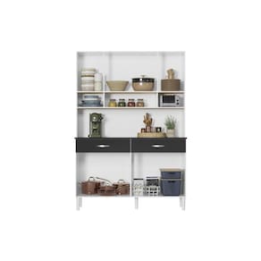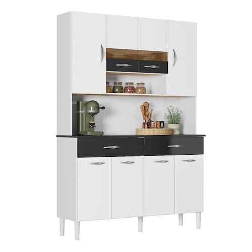 Possui oito portas, sendo duas com vidro temperado, e duas gavetas com corrediças e dobradiças metálicas, que garantem bom funcionamento e maior vida útil. Conta também com prateleiras internas e nicho para acomodar pequenos objetos.