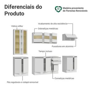 Fabricada em 100% MDF, a linha Smart oferece durabilidade e acabamento de alta resistência. A estrutura e as frentes são em acabamento branco. Os aéreos e a cristaleira se destacam pelas portas com vidro reflex, que adicionam elegância ao ambiente.