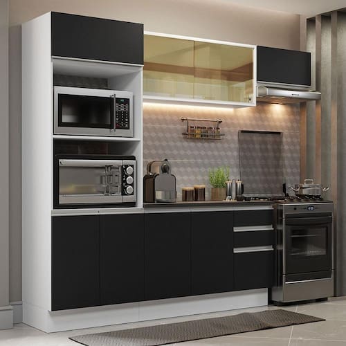 Feita em 100% MDF, possui ferragens de qualidade como puxadores em alumínio, dobradiças metálicas e corrediças telescópicas para abertura total das gavetas. O vidro reflex no aéreo também é um dos destaques desta versão.