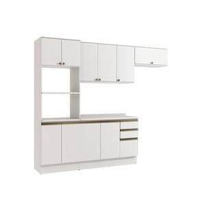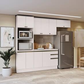 Acabamento: Pintura Brilho | Cor: Branco | Corrediças: Telescópicas | Dobradiça: Com Amortecimento / Sem Amortecimento | Garantia: 3 meses para defeito de fabricação | Matéria-prima: MDF / MDP | Peso suportado por cada gaveta: 6 Kg | Peso suportado por cada prateleira: 7 kg | Puxadores: Metálicos / Puxadores de Metal e de Alumínio | Quantidade de gavetas: 3 | Quantidade de portas: 1 / 3 | Quantidade de prateleiras: 1 / 2 / 4 | Sistema de montagem: Parafuso Philips | Tipo de porta: Bater | Duração da garantia: 3 meses | Tipo de garantia: Garantia do fabricante | Montagem: Necessita montagem | Tipo de móveis de cozinha: Combo de móveis de cozinha | Requer montagem: Sim