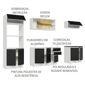 Para completar, os pés da cozinha são reguláveis em PVC e o rodapé removível em MDF, com encaixe fácil para retirar na hora da limpeza.