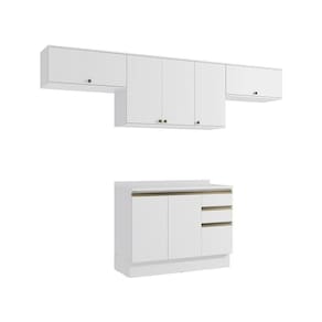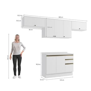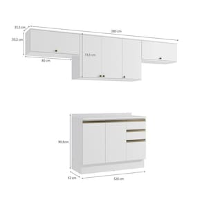 Acabamento: Pintura Brilho | Cor: Branco | Corrediças: Telescópicas | Dobradiça: Com Amortecimento / Sem Amortecimento | Garantia: 3 meses para defeito de fabricação | Matéria-prima: MDF / MDP | Peso suportado por cada gaveta: 6 Kg | Peso suportado por cada prateleira: 7 kg | Puxadores: Metálicos / Puxadores de Metal e de Alumínio | Quantidade de gavetas: 3 | Quantidade de portas: 1 / 3 | Quantidade de prateleiras: 1 / 2 | Sistema de montagem: Parafuso Philips | Tipo de porta: Bater | Duração da garantia: 3 meses | Tipo de garantia: Garantia do fabricante | Montagem: Necessita montagem | Tipo de móveis de cozinha: Combo de móveis de cozinha | Requer montagem: Sim