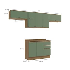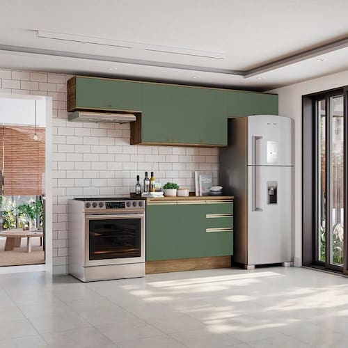 Transforme sua cozinha com toda a beleza e praticidade do Conjunto CB1417 da Cozinha Celeste Kappesberg. Produzido 100% em MDF de 15mm, o que garante mais robustez, firmeza e qualidade, além de um acabamento perfeito. São 2,30m de altura, 2,80m de largura e 52cm de profundidade no balcão e 37cm nos aéreos. A caixaria, em pintura touch na cor nogueira, conta com a textura dos veios da madeira, enquanto as frentes são na cor verde oliva, com acabamento fosco.