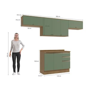 Acabamento: Pintura Fosco / Pintura Touch | Cor: Nogueira/Verde Oliva | Corrediças: Telescópicas | Dobradiça: Com Amortecimento / Sem Amortecimento | Garantia: 3 meses para defeito de fabricação | Matéria-prima: MDF / MDP | Peso suportado por cada gaveta: 6 Kg | Peso suportado por cada prateleira: 7 kg | Puxadores: Metálicos / Puxadores de Metal e de Alumínio | Quantidade de gavetas: 3 | Quantidade de portas: 1 / 3 | Quantidade de prateleiras: 1 / 2 | Sistema de montagem: Parafuso Philips | Tipo de porta: Bater | Duração da garantia: 3 meses | Tipo de garantia: Garantia do fabricante | Montagem: Necessita montagem | Tipo de móveis de cozinha: Combo de móveis de cozinha | Requer montagem: Sim