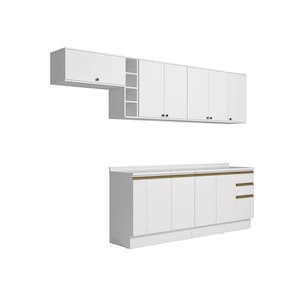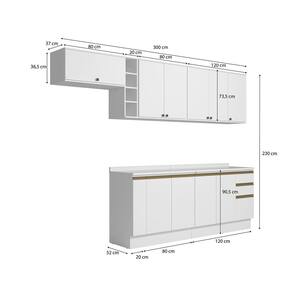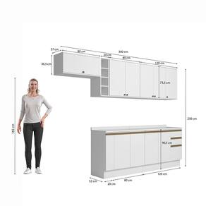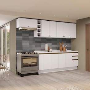 Completo e muito funcional, perfeito para todos os espaços, o combo une três balcões, medindo 20cm, com o porta-tempero, 80cm e o balcão de pia, além dos aéreos nas mesmas medidas e um basculante, uma composição versátil e indispensável para quem procura por funcionalidade.