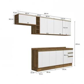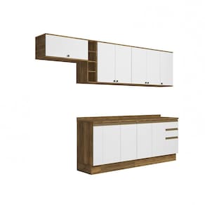 Uma combinação clássica e linda, perfeita para todos os ambientes e para quem não abre mão de sofisticação. Unindo o conforto do amadeirado e a luminosidade do branco brilho, você terá um ambiente confortável e aconchegante para preparar receitas e receber sua família e amigos. Completo e muito funcional, perfeito para todos os espaços, o combo une três balcões, medindo 20cm, com o porta-tempero, 80cm e o balcão de pia, além dos aéreos nas mesmas medidas e um basculante, uma composição versátil e indispensável para quem procura por funcionalidade.