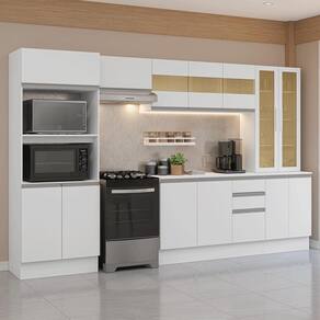Fabricada em 100% MDF, a linha Smart garante durabilidade e alta resistência. Toda a cozinha é em branco, proporcionando um visual clean e elegante. A cristaleira e o aéreo possuem portas em vidro reflex, permitindo exibir suas louças e utensílios, mantendo o ambiente sempre arrumado e acessível.