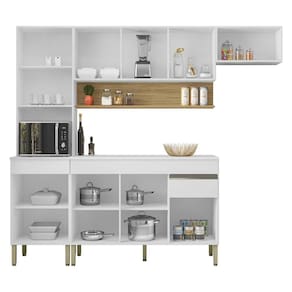 Conheça Cozinha Line que une praticidade e estilo. Fabricada com MDP de 15 mm, oferece durabilidade e possibilidade para instalar uma pia. Com nove portas, uma gaveta e prateleiras internas espaçosas, garante excelente organização. O passa-fios mantém seus cabos organizados, e as dobradiças e corrediças metálicas oferecem movimento suave. Seus pés reguláveis garantem estabilidade em qualquer piso. O acabamento de alta qualidade, com pintura sensível ao toque e secagem UV, oferece sofisticação e resistência.