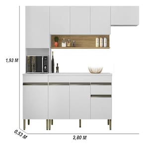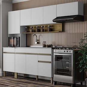 Conheça Cozinha Line que une praticidade e estilo. Fabricada com MDP de 15 mm, oferece durabilidade e possibilidade para instalar uma pia. Com nove portas, uma gaveta e prateleiras internas espaçosas, garante excelente organização. O passa-fios mantém seus cabos organizados, e as dobradiças e corrediças metálicas oferecem movimento suave. Seus pés reguláveis garantem estabilidade em qualquer piso. O acabamento de alta qualidade, com pintura sensível ao toque e secagem UV, oferece sofisticação e resistência.