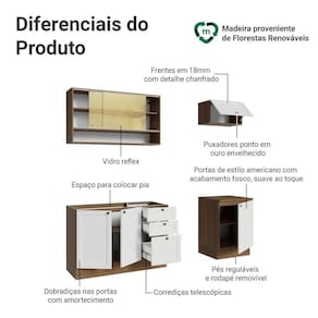 O acabamento de alta resistência da estrutura é em tom amadeirado Rustic, das frentes em Branco e possui uma textura suave ao toque. O destaque fica por conta dos puxadores ponto em ouro envelhecido, feitos com metal resistente, trazem personalidade e um charme único. Outro diferencial está no detalhe chanfrado das frentes, que forma molduras elegantes e dá profundidade ao design.