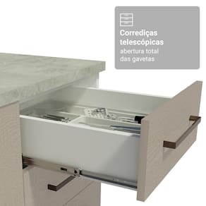 O móvel conta com puxadores com alça em alumínio, gavetas com corrediças telescópicas de abertura total, portas com amortecimento para fechamento suave e pés reguláveis em PVC.