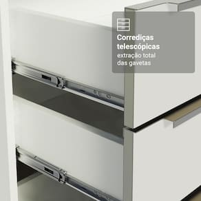 Fabricada com alto padrão de qualidade, a cozinha conta com puxadores em alumínio, gavetas com corrediças telescópicas de abertura total, portas com amortecimento para fechamento suave e pés reguláveis em PVC.