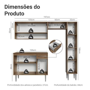 - 44 cm de profundidade nos balcões e 27cm nos aéreos/paneleiro