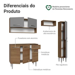 Esta composição inclui um paneleiro com duas portas, um balcão de 105 cm com três portas e uma gaveta, e um armário aéreo de duas portas e um nicho aberto, oferecendo amplos espaços para armazenamento e organização. O acabamento em tom amadeirado Rustic e Cinza confere um visual moderno à sua cozinha.