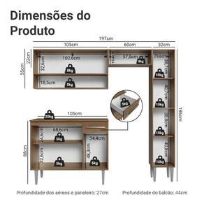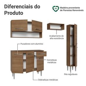 Esta composição inclui um paneleiro com duas portas, um balcão de 105 cm com três portas e uma gaveta, e um armário aéreo de duas portas e um nicho aberto, oferecendo amplos espaços para armazenamento e organização. Com acabamemto em tom amadeirado Rustic, sua cozinha une visual elegante e aconchego em um só ambiente.
