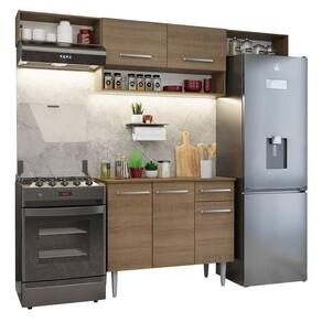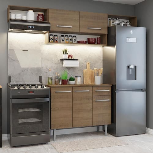 Para garantir melhor aproveitamento do espaço você pode acomodar fogão e geladeira abaixo dos nichos abertos das laterais, tranzendo ainda mais funcionalidade para sua cozinha. O acabamento todo em amadeirado Rustic valoriza o ambiente com um visual acolhedor e atemporal.