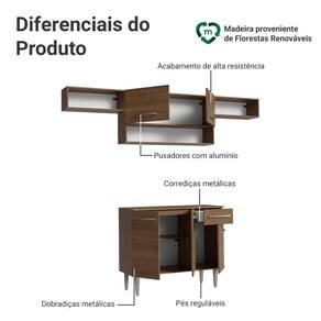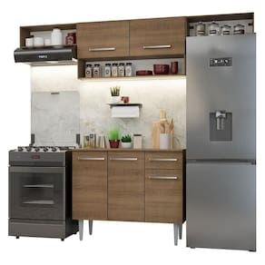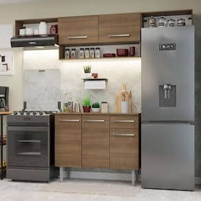 Para garantir melhor aproveitamento do espaço você pode acomodar fogão e geladeira abaixo dos nichos abertos das laterais, tranzendo ainda mais funcionalidade para sua cozinha. O acabamento todo em amadeirado Rustic valoriza o ambiente com um visual acolhedor e atemporal.