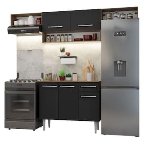 Para garantir melhor aproveitamento do espaço você pode acomodar fogão e geladeira abaixo dos nichos abertos das laterais, tranzendo ainda mais funcionalidade para sua cozinha. A combinação do amadeirado Rustic com preto traz mais personalidade ao ambiente.