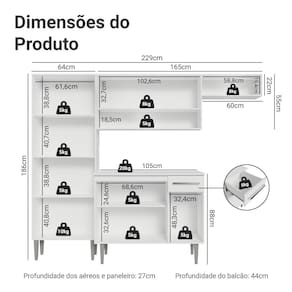 - 44 cm de profundidade nos balcões e 27cm nos aéreos/paneleiro