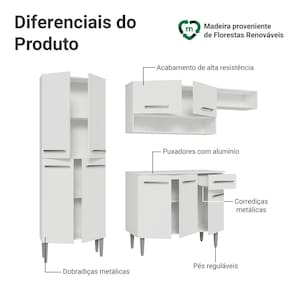 A linha Emilly se destaca pelo acabamento de alta resistência, puxadores em alumínio, corrediças e dobradiças metálicas, garantindo durabilidade no uso diário. Os pés reguláveis proporcionam estabilidade e facilitam a limpeza. O acabamento branco da cozinha Emilly transmite leveza ao ambiente, deixando o espaço mais iluminado.