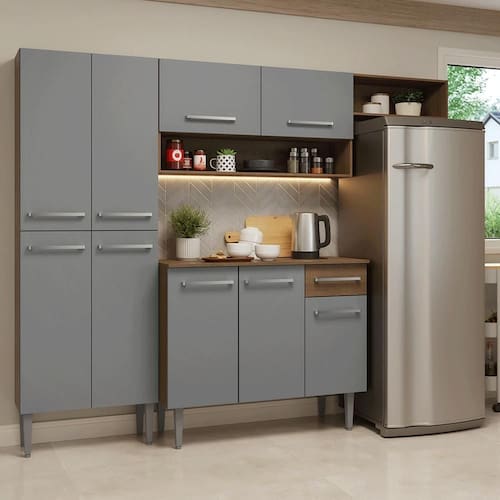 A linha Emilly se destaca pelo acabamento de alta resistência, puxadores em alumínio, corrediças e dobradiças metálicas, garantindo durabilidade no uso diário. Os pés reguláveis proporcionam estabilidade e facilitam a limpeza. O acabamento em tom amadeirado Rustic com Cinza confere um visual contemporâneo e equilibrado à sua cozinha.