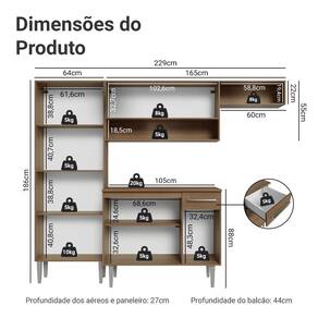 - 44 cm de profundidade nos balcões e 27cm nos aéreos/paneleiro