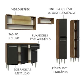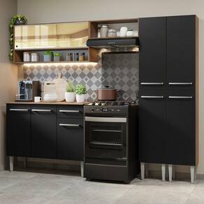Para completar, o acabamento da cozinha combina os tons preto e amadeirado Rustic, feito em Pintura Poliéster ecológica, com sete camadas de proteção resistentes a álcool, água e calor.