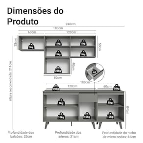 - 52 cm de profundidade nos balcões, 31 cm nos aéreos e 45 cm no nicho para micro-ondas