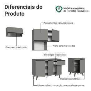 Produzido com materiais de qualidade, o balcão possui dobradiças metálicas nas portas e puxadores em perfil de alumínio, garantindo resistência. As gavetas possuem corrediças que permitem abertura total, oferecendo mais praticidade. O tampo é removível, possibilitando a instalação de cuba ou pedra e o acabamento é de alta resistência, garantindo durabilidade no uso diário.