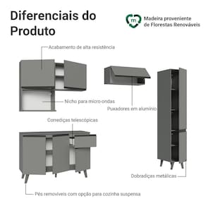 Produzido com materiais de qualidade, o balcão possui dobradiças metálicas nas portas e puxadores em perfil de alumínio, garantindo resistência. As gavetas possuem corrediças que permitem abertura total, oferecendo mais praticidade. O tampo é removível, possibilitando a instalação de cuba ou pedra e o acabamento é de alta resistência, garantindo durabilidade no uso diário.