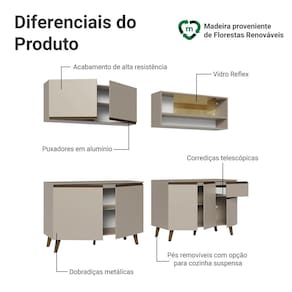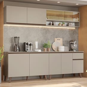 A Cozinha Completa de 240 cm é ideal para quem busca praticidade, estilo e bom aproveitamento de espaço. Seus principais diferenciais estão no armário aéreo com portas de vidro reflex, que adiciona um toque sofisticado ao ambiente.