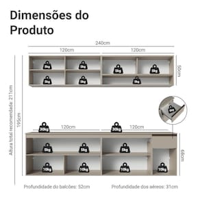 - 52 cm de profundidade nos balcões e 31 cm nos aéreos