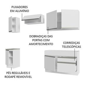 A fabricação é feita com materiais de qualidade, como corrediças telescópicas, puxadores com perfil total em alumínio, dobradiças com amortecimento e pés reguláveis em PVC, com rodapé removível em MDP.