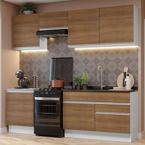 Para completar, o acabamento da estrutura é branco e o das portas e frentes é no padrão amadeirado Rustic. Feito em Pintura Poliéster ecológica, que consiste na aplicação de 7 camadas de proteção resistentes a álcool, água e calor.