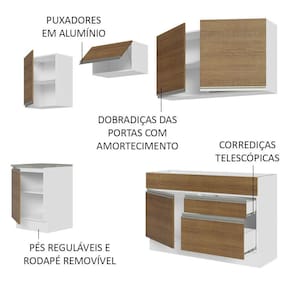 A fabricação é feita com materiais de qualidade, como corrediças telescópicas, puxadores com perfil total em alumínio, dobradiças com amortecimento e pés reguláveis em PVC, com rodapé removível em MDP.