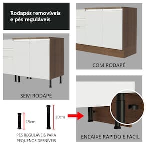 A fabricação é feita com materiais de qualidade, como corrediças telescópicas, puxadores com perfil total em alumínio, dobradiças com amortecimento e pés reguláveis em PVC, com rodapé removível em MDP.