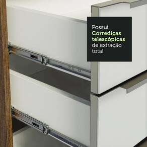 Fabricada com itens de qualidade, possui corrediças telescópicas, dobradiças com amortecedores para o fechamento suave das portas, puxadores em alumínio e pés reguláveis em PVC, com rodapé removível em MDP.