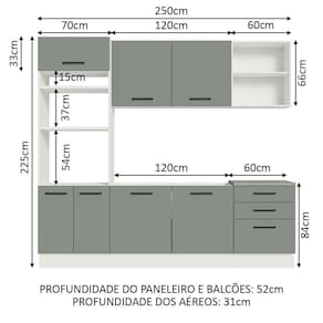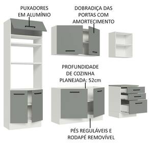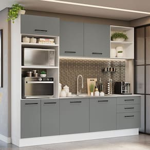 Para completar, a organização de todos os itens da cozinha vai ficar mais fácil, já que o móvel conta com diversas gavetas, prateleiras e nichos. A torre oferece espaço para forno e micro-ondas e o balcão maior tem espaço para pia de inox ou pedra, nas medidas de 120 x 52 cm.