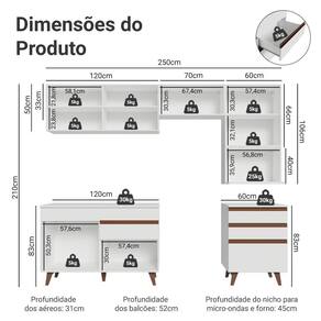- 31 cm de profundidade nos aéreos, 52 cm nos balcões e 45 cm no nicho para micro-ondas