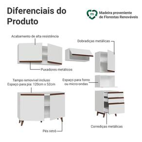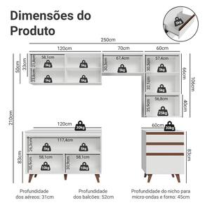 - 31 cm de profundidade nos aéreos, 52 cm nos balcões e 45 cm no nicho para micro-ondas